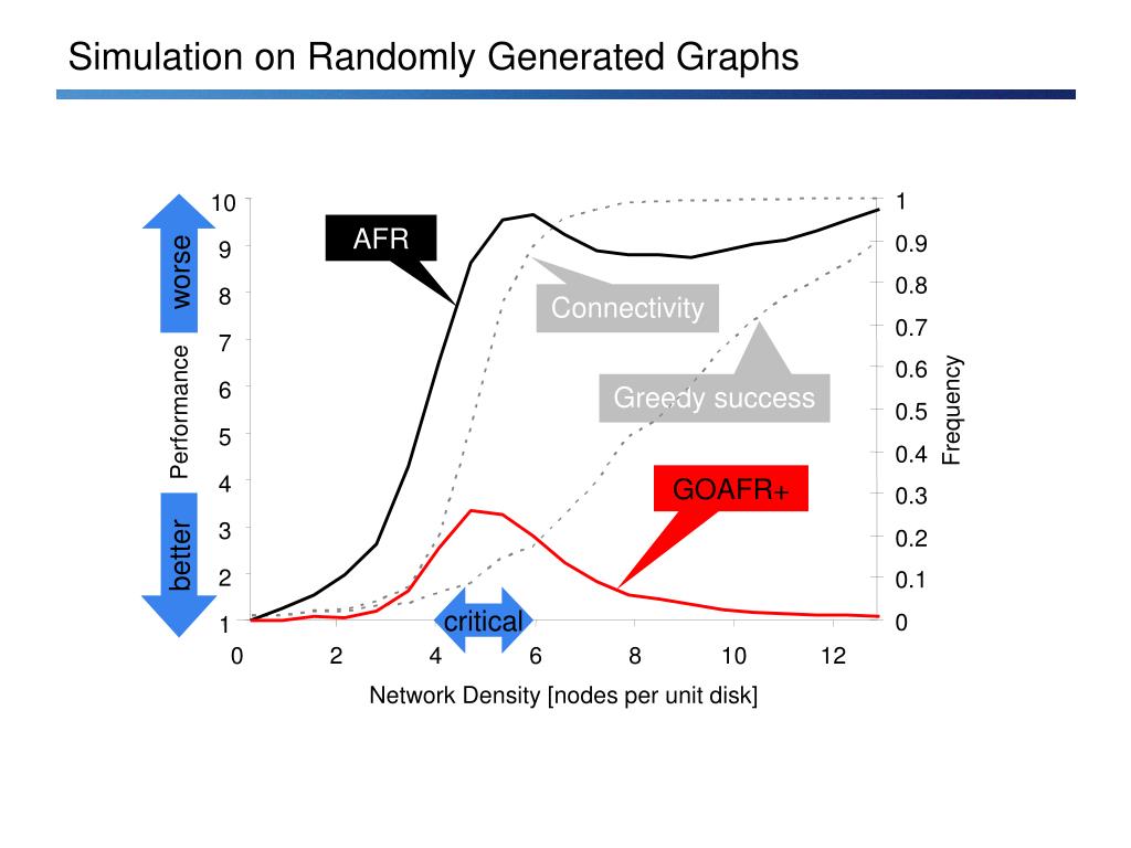 Simulation on Randomly Generated Graphs 1 10 AFR worse 0.9 9 0.8 8 Connectivity 0.7 7 0.6 Greedy success 6 Frequency 0.5 Performance 5 0.4 GOAFR+ 4 0.3 3 0.2 better 2 0.1 critical 0 1 0 2 4 6 8 10 12 Network Density [nodes per unit disk]