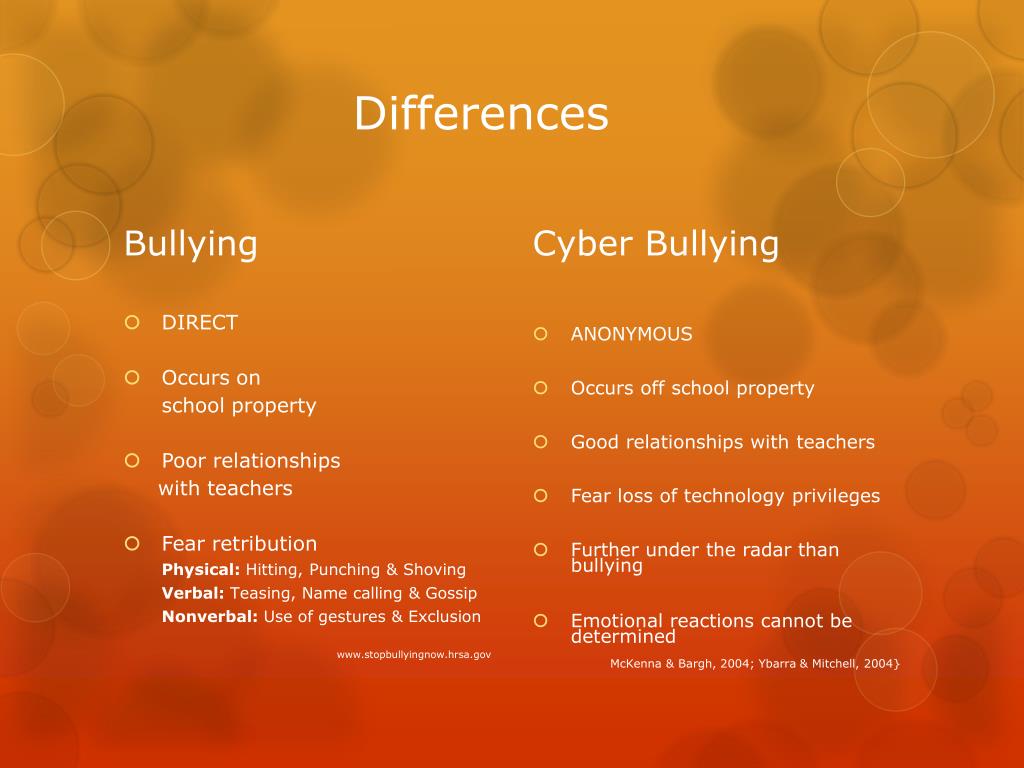 Differences Bullying Cyber Bullying ANONYMOUS Occurs off school property Good relationships with teachers Fear loss of technology privileges Further under the radar than bullying Emotional reactions cannot be determined McKenna & Bargh, 2004; Ybarra & Mitchell, 2004} • DIRECT • Occurs on school property • Poor relationships with teachers • Fear retribution Physical: Hitting, Punching & Shoving Verbal: Teasing, Name calling & Gossip Nonverbal: Use of gestures & Exclusion www.stopbullyingnow.hrsa.gov