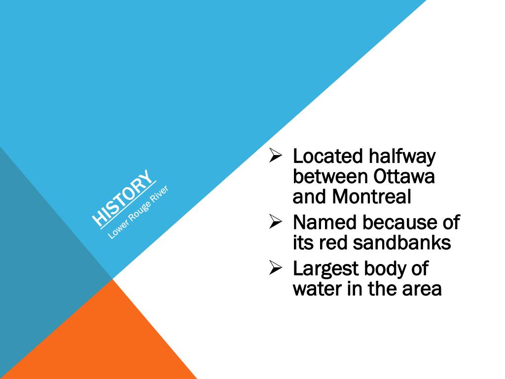 History Lower Rouge River • Located halfway between Ottawa and Montreal • Named because of its red sandbanks • Largest body of water in the area