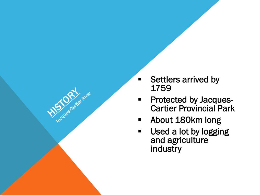 History Jacques-Cartier River • Settlers arrived by 1759 • Protected by Jacques-Cartier Provincial Park • About 180km long • Used a lot by logging and agriculture industry