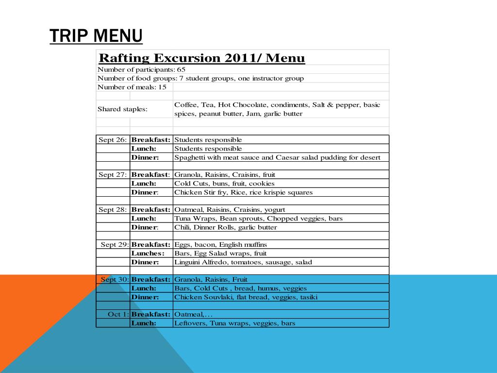 Quebec Rafting Trip. Melissa Lavery. Table of Contents. Facts Itinerary Distance Travelled Equipment Lists Food Groups Menu Plan Instructors History Group Interactions Facility Analysis Literature Appendices References . Facts. 11 Rafts 2 Buses 1 Truck and trailer Weather :
