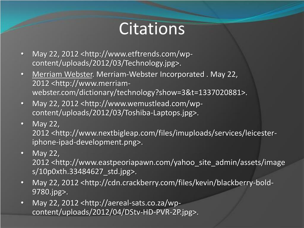 Citations • May 22, 2012 <http://www.etftrends.com/wp-content/uploads/2012/03/Technology.jpg>. • Merriam Webster. Merriam-Webster Incorporated . May 22, 2012 <http://www.merriam-webster.com/dictionary/technology?show=3&t=1337020881>. • May 22, 2012 <http://www.wemustlead.com/wp-content/uploads/2012/03/Toshiba-Laptops.jpg>. • May 22, 2012 <http://www.nextbigleap.com/files/imuploads/services/leicester-iphone-ipad-development.png>. • May 22, 2012 <http://www.eastpeoriapawn.com/yahoo_site_admin/assets/images/10p0xth.33484627_std.jpg>. • May 22, 2012 <http://cdn.crackberry.com/files/kevin/blackberry-bold-9780.jpg>. • May 22, 2012 <http://aereal-sats.co.za/wp-content/uploads/2012/04/DStv-HD-PVR-2P.jpg>.