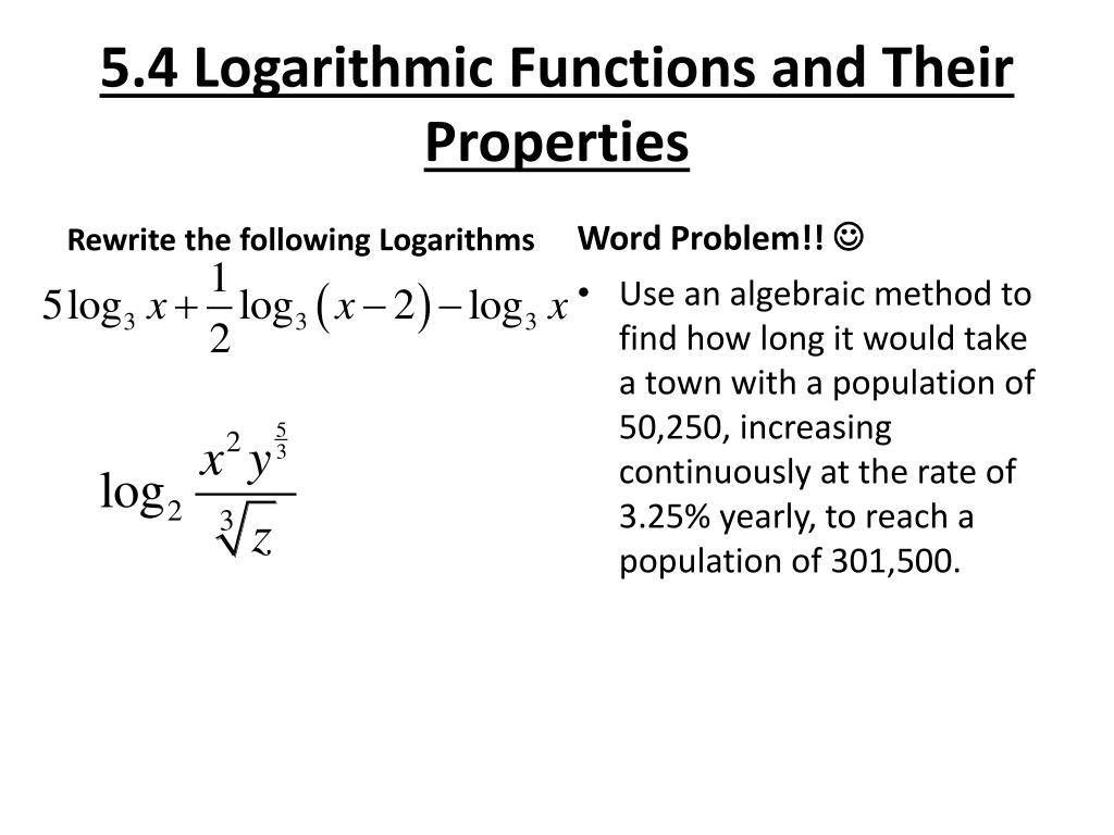 5.4 Logarithmic Functions and Their Properties Rewrite the following Logarithms Word Problem!! Use an algebraic method to find how long it would take a town with a population of 50,250, increasing continuously at the rate of 3.25% yearly, to reach a population of 301,500.