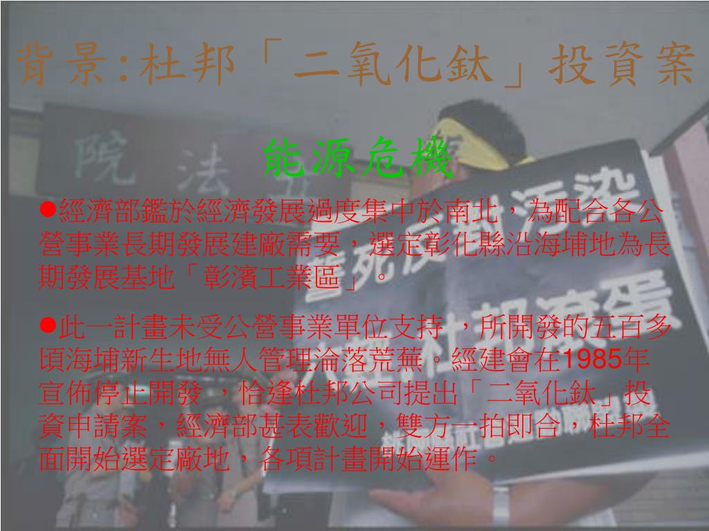 背景:杜邦「二氧化鈦」投資案 能源危機 • 經濟部鑑於經濟發展過度集中於南北,為配合各公營事業長期發展建廠需要,選定彰化縣沿海埔地為長期發展基地「彰濱工業區」。 • 此一計畫未受公營事業單位支持 ,所開發的五百多頃海埔新生地無人管理淪落荒蕪。經建會在1985年宣佈停止開發 ,恰逢杜邦公司提出「二氧化鈦」投資申請案,經濟部甚表歡迎,雙方一拍即合,杜邦全面開始選定廠地,各項計畫開始運作。