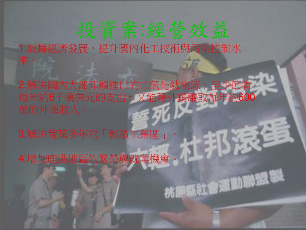 投資案:經營效益 1.鼓舞經濟發展,提升國內化工技術與污染控制水 準。 2.解決國內大部仰賴進口的二氧化鈦來源,至少節省 每年約6千萬美元的支出,又能藉外銷賺取每年約600 萬的外匯收入。 3.解決荒蕪多年的「彰濱工業區」。 4.增加鹿港地區的繁榮與就業機會。