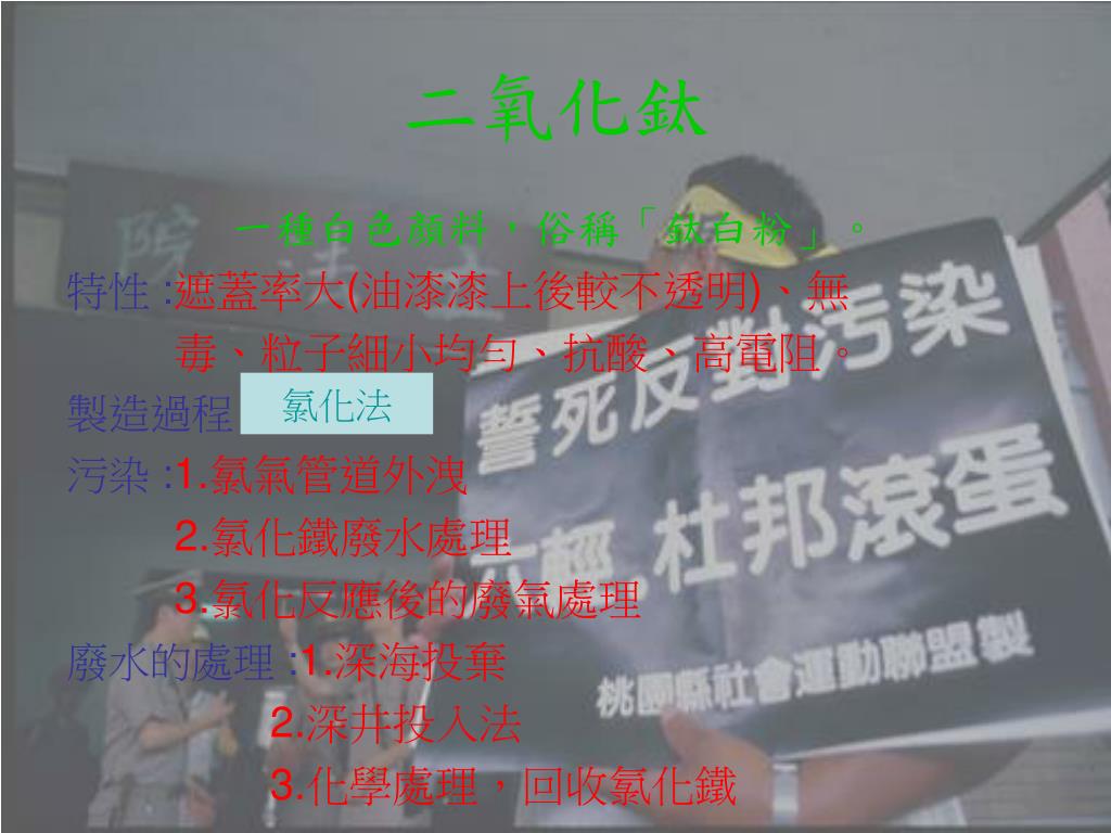 二氧化鈦 一種白色顏料,俗稱「鈦白粉」。 特性 :遮蓋率大(油漆漆上後較不透明)、無 毒、粒子細小均勻、抗酸、高電阻。 製造過程 : 污染 :1.氯氣管道外洩 2.氯化鐵廢水處理 3.氯化反應後的廢氣處理 廢水的處理:1.深海投棄 2.深井投入法 3.化學處理,回收氯化鐵 氯化法
