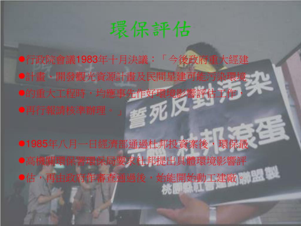環保評估 • 行政院會議1983年十月決議:「今後政府重大經建 • 計畫、開發觀光資源計畫及民間星建可能污染環境 • 的重大工程時,均應事先作好環境影響評估工作, • 再行報請核準辦理。」 • 1985年八月一日經濟部通過杜邦投資案後,環保最 • 高機關環保署環保局要求杜邦提出具體環境影響評 • 估,再由政府作審查通過後,始能開始動工建廠。