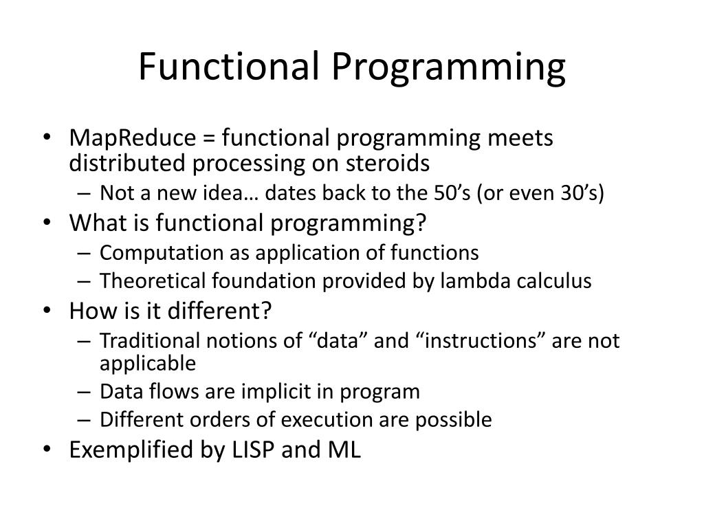 Functional Programming • MapReduce = functional programming meets distributed processing on steroids • Not a new idea… dates back to the 50’s (or even 30’s) • What is functional programming? • Computation as application of functions • Theoretical foundation provided by lambda calculus • How is it different? • Traditional notions of “data” and “instructions” are not applicable • Data flows are implicit in program • Different orders of execution are possible • Exemplified by LISP and ML