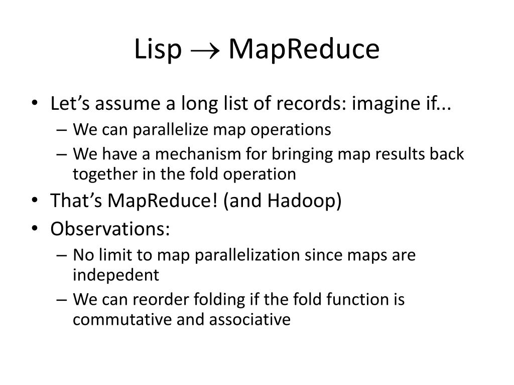 Lisp MapReduce • Let’s assume a long list of records: imagine if... • We can parallelize map operations • We have a mechanism for bringing map results back together in the fold operation • That’s MapReduce! (and Hadoop) • Observations: • No limit to map parallelization since maps are indepedent • We can reorder folding if the fold function is commutative and associative