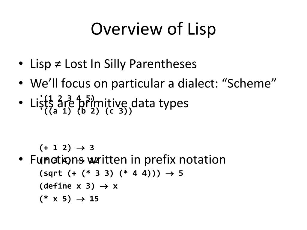 Overview of Lisp • Lisp ≠ Lost In Silly Parentheses • We’ll focus on particular a dialect: “Scheme” • Lists are primitive data types • Functions written in prefix notation '(1 2 3 4 5) '((a 1) (b 2) (c 3)) (+ 1 2) 3 (* 3 4) 12 (sqrt (+ (* 3 3) (* 4 4))) 5 (define x 3) x (* x 5) 15
