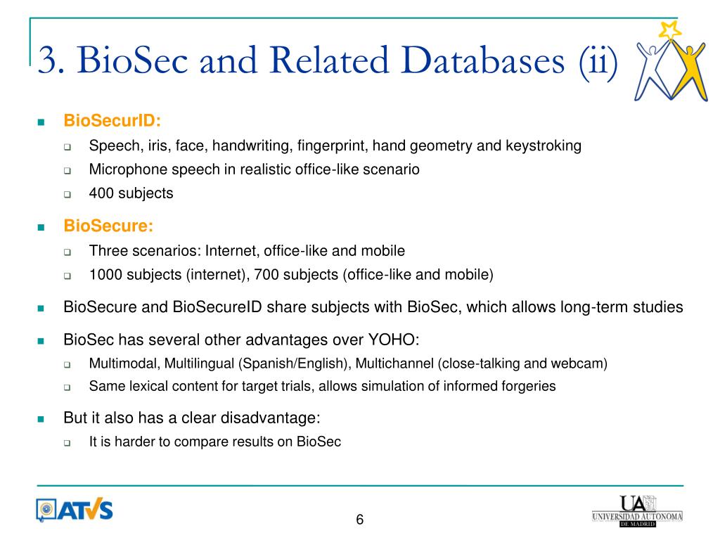 3. BioSec and Related Databases (ii) • BioSecurID: • Speech, iris, face, handwriting, fingerprint, hand geometry and keystroking • Microphone speech in realistic office-like scenario • 400 subjects • BioSecure: • Three scenarios: Internet, office-like and mobile • 1000 subjects (internet), 700 subjects (office-like and mobile) • BioSecure and BioSecureID share subjects with BioSec, which allows long-term studies • BioSec has several other advantages over YOHO: • Multimodal, Multilingual (Spanish/English), Multichannel (close-talking and webcam) • Same lexical content for target trials, allows simulation of informed forgeries • But it also has a clear disadvantage: • It is harder to compare results on BioSec