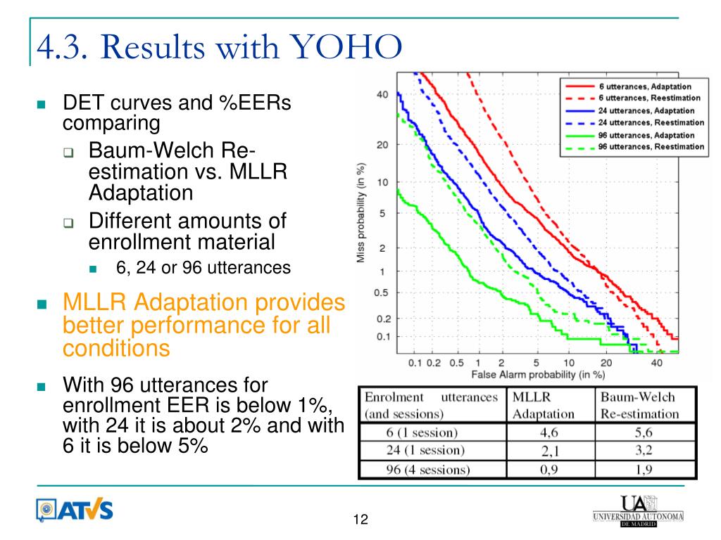 4.3. Results with YOHO • DET curves and %EERs comparing • Baum-Welch Re-estimation vs. MLLR Adaptation • Different amounts of enrollment material • 6, 24 or 96 utterances • MLLR Adaptation provides better performance for all conditions • With 96 utterances for enrollment EER is below 1%, with 24 it is about 2% and with 6 it is below 5%