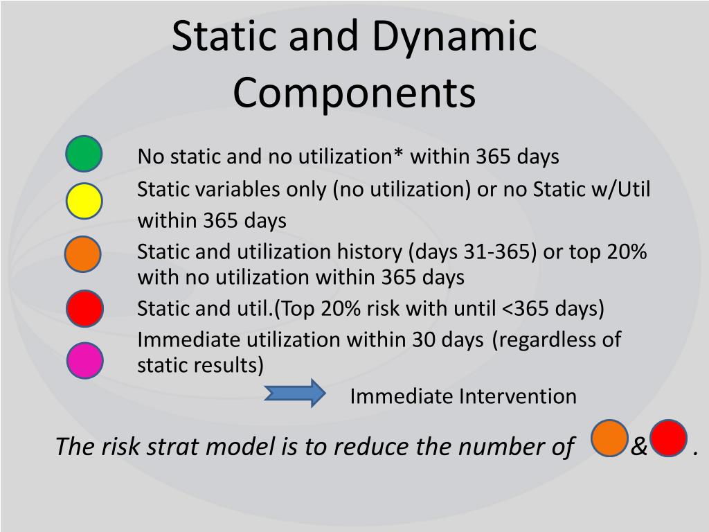 Static and Dynamic Components No static and no utilization* within 365 days Static variables only (no utilization) or no Static w/Util within 365 days Static and utilization history (days 31-365) or top 20% with no utilization within 365 days Static and util.(Top 20% risk with until <365 days) Immediate utilization within 30 days (regardless of static results) Immediate Intervention The risk strat model is to reduce the number of & .