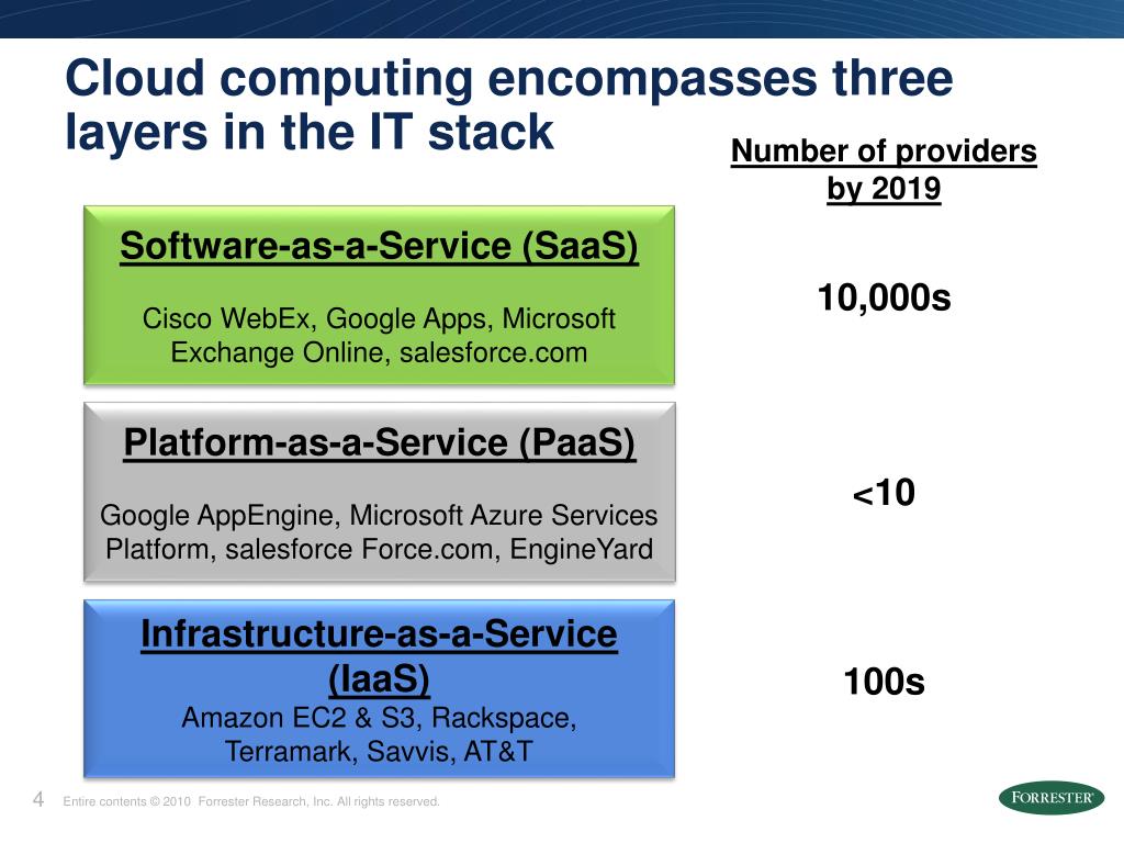 Cloud computing encompasses three layers in the IT stack Number of providers by 2019 Software-as-a-Service (SaaS) Cisco WebEx, Google Apps, Microsoft Exchange Online, salesforce.com 10,000s Platform-as-a-Service (PaaS) Google AppEngine, Microsoft Azure Services Platform, salesforceForce.com, EngineYard <10 Infrastructure-as-a-Service (IaaS) Amazon EC2 & S3, Rackspace, Terramark, Savvis, AT&T 100s