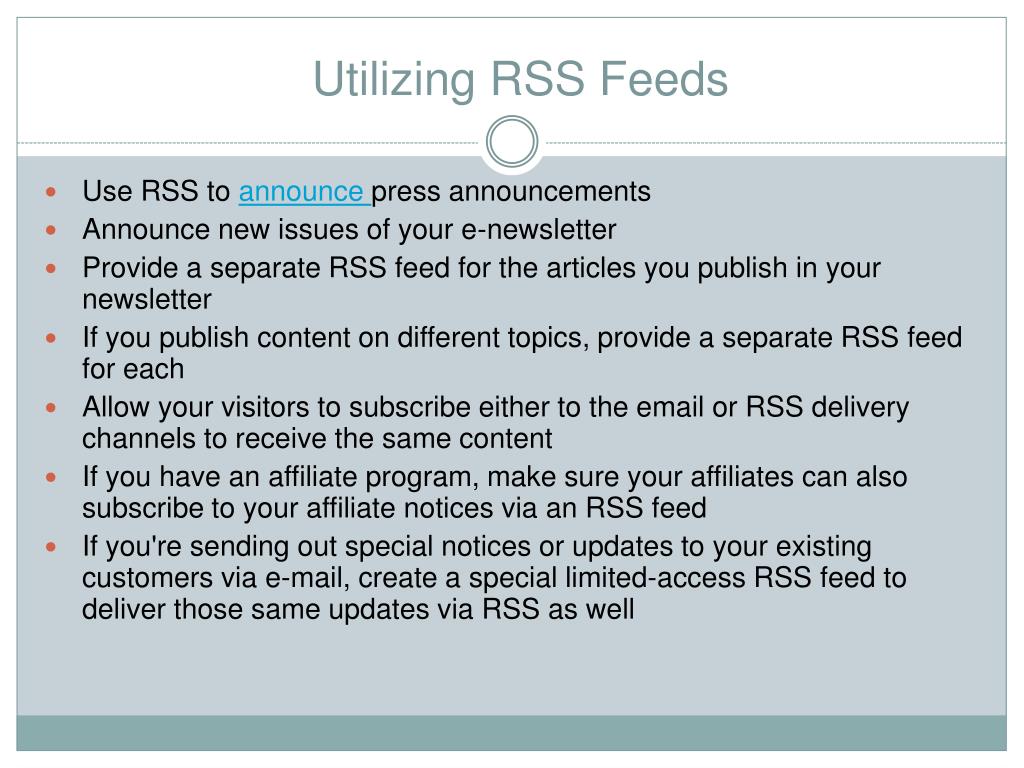 Utilizing RSS Feeds • Use RSS to announce press announcements • Announce new issues of your e-newsletter • Provide a separate RSS feed for the articles you publish in your newsletter • If you publish content on different topics, provide a separate RSS feed for each • Allow your visitors to subscribe either to the email or RSS delivery channels to receive the same content • If you have an affiliate program, make sure your affiliates can also subscribe to your affiliate notices via an RSS feed • If you're sending out special notices or updates to your existing customers via e-mail, create a special limited-access RSS feed to deliver those same updates via RSS as well