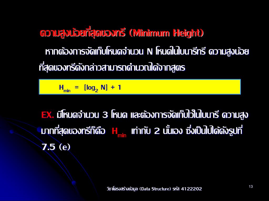 ความสูงน้อยที่สุดของทรี (Minimum Height) หากต้องการจัดเก็บโหนดจำนวน N โหนดในไบนารีทรี ความสูงน้อยที่สุดของทรีดังกล่าวสามารถคำนวณได้จากสูตร Hmin = [log2 N] + 1 EX. มีโหนดจำนวน 3 โหนด และต้องการจัดเก็บไว้ในไบนารี ความสูงมากที่สุดของทรีก็คือ Hmin เท่ากับ 2 นั้นเอง ซึ่งเป็นไปได้ดังรูปที่ 7.5 (e) วิชาโครงสร้างข้อมูล (Data Structure) รหัส 4122202