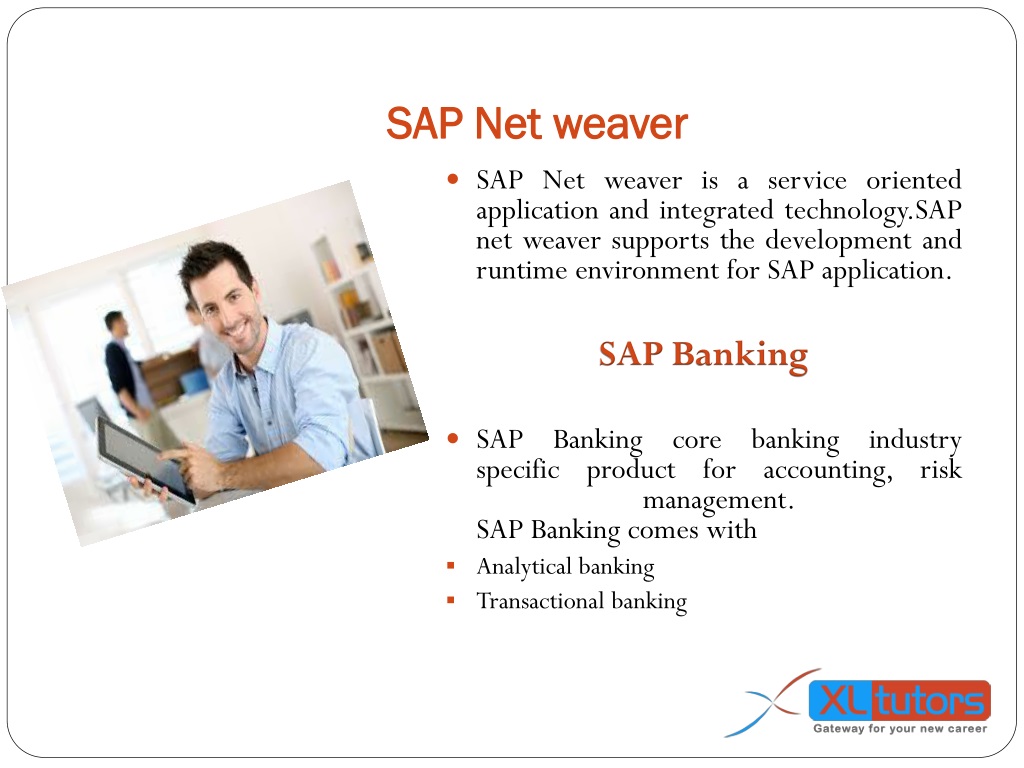 SAP Net weaver • SAP Net weaver is a service oriented application and integrated technology.SAP net weaver supports the development and runtime environment for SAP application. SAP Banking • SAP Banking core banking industry specific product for accounting, risk management.SAP Banking comes with • Analytical banking • Transactional banking