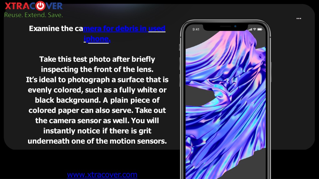 Checkfordentsatthefront. Surfacescratchesarenormally harmless,butfracturesand deeperdamageshouldbeavoided. Thegapallowsdusttoenterthe gadget.Next,makesurethepower supplyiscleanandclearofdebris andgrit.It’spreferabletoplace the iPhone in front of bright light forabit. www.xtracover.com