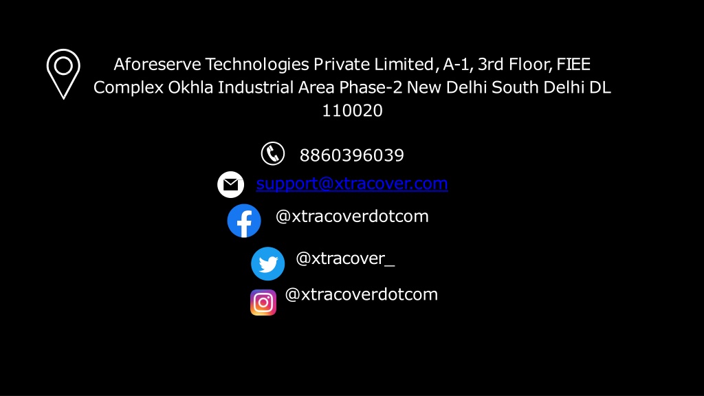 AforeserveTechnologiesPrivateLimited,A-1,3rdFloor,FIEE ComplexOkhlaIndustrialAreaPhase-2NewDelhiSouthDelhiDL 110020 8860396039 support@xtracover.com @xtracoverdotcom @xtracover_ @xtracoverdotcom