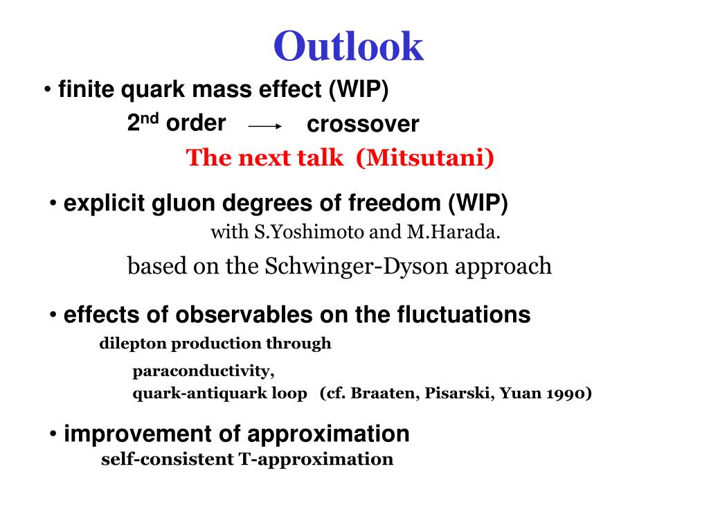 Outlook • finite quark mass effect (WIP) 2nd order crossover The next talk (Mitsutani) • explicit gluon degrees of freedom (WIP) with S.Yoshimoto and M.Harada. based on the Schwinger-Dyson approach • effects of observables on the fluctuations dilepton production through paraconductivity, quark-antiquark loop (cf. Braaten, Pisarski, Yuan 1990) • improvement of approximation self-consistent T-approximation