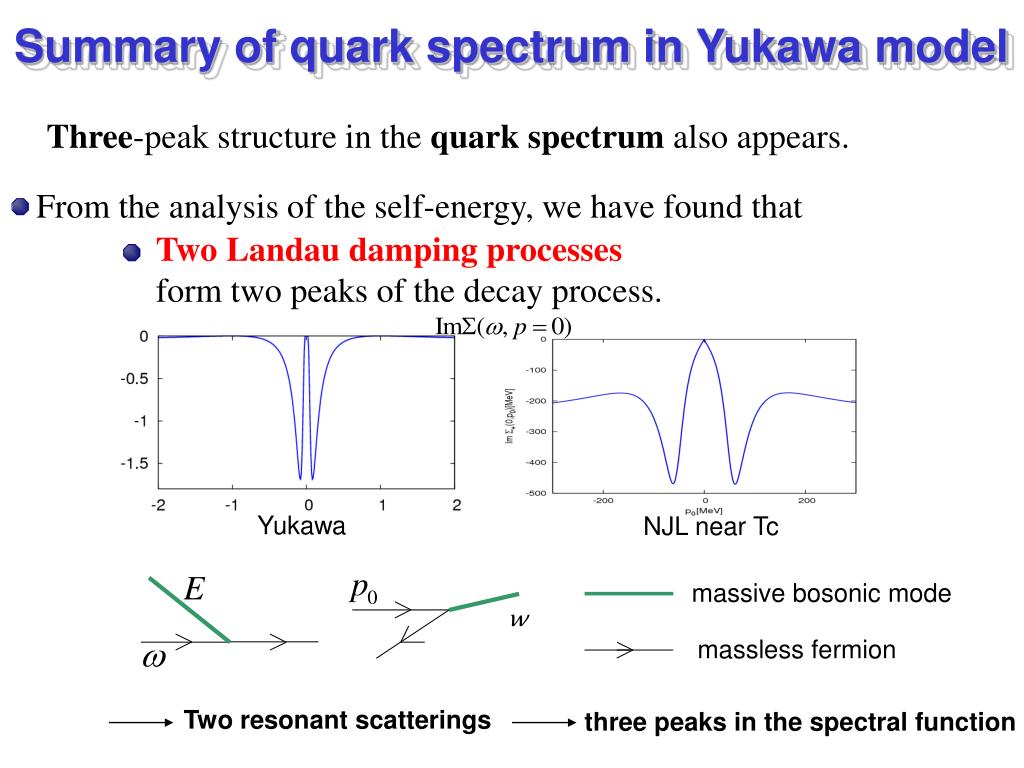 Summary of quark spectrum in Yukawa model Three-peak structure in the quark spectrum also appears. From the analysis of the self-energy, we have found that Two Landau damping processes form two peaks of the decay process. Yukawa NJL near Tc E massive bosonic mode w massless fermion Two resonant scatterings three peaks in the spectral function