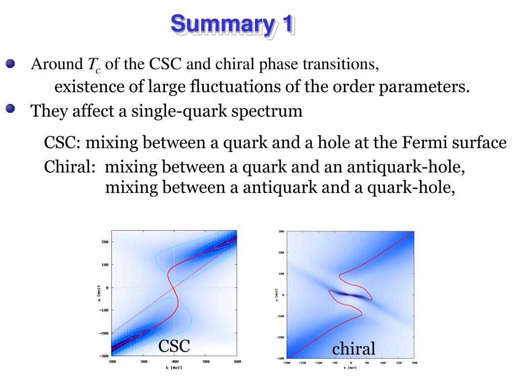 Summary 1 Around Tcof the CSC and chiral phase transitions, existence of large fluctuations of the order parameters. They affect a single-quark spectrum CSC: mixing between a quark and a hole at the Fermi surface Chiral: mixing between a quark and an antiquark-hole, mixing between a antiquark and a quark-hole, CSC chiral