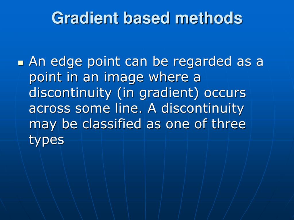 Gradient based methods • An edge point can be regarded as a point in an image where a discontinuity (in gradient) occurs across some line. A discontinuity may be classified as one of three types