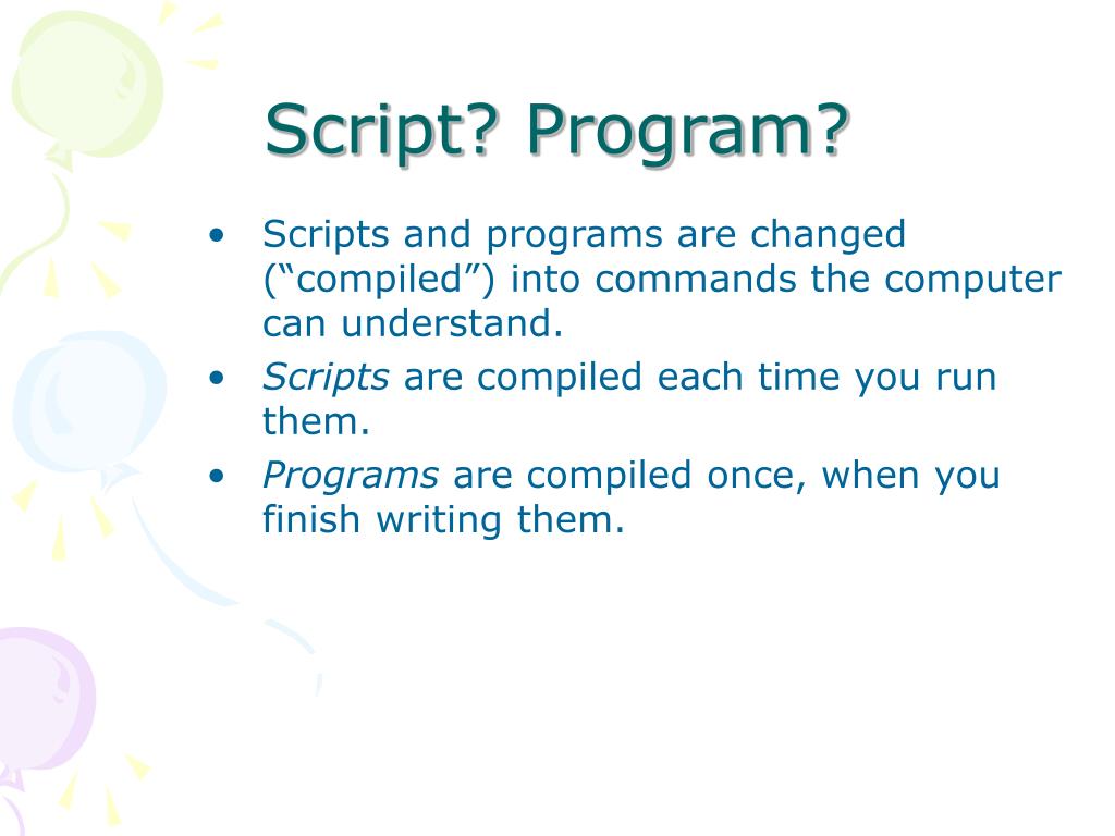 Script? Program? • Scripts and programs are changed (“compiled”) into commands the computer can understand. • Scripts are compiled each time you run them. • Programs are compiled once, when you finish writing them.