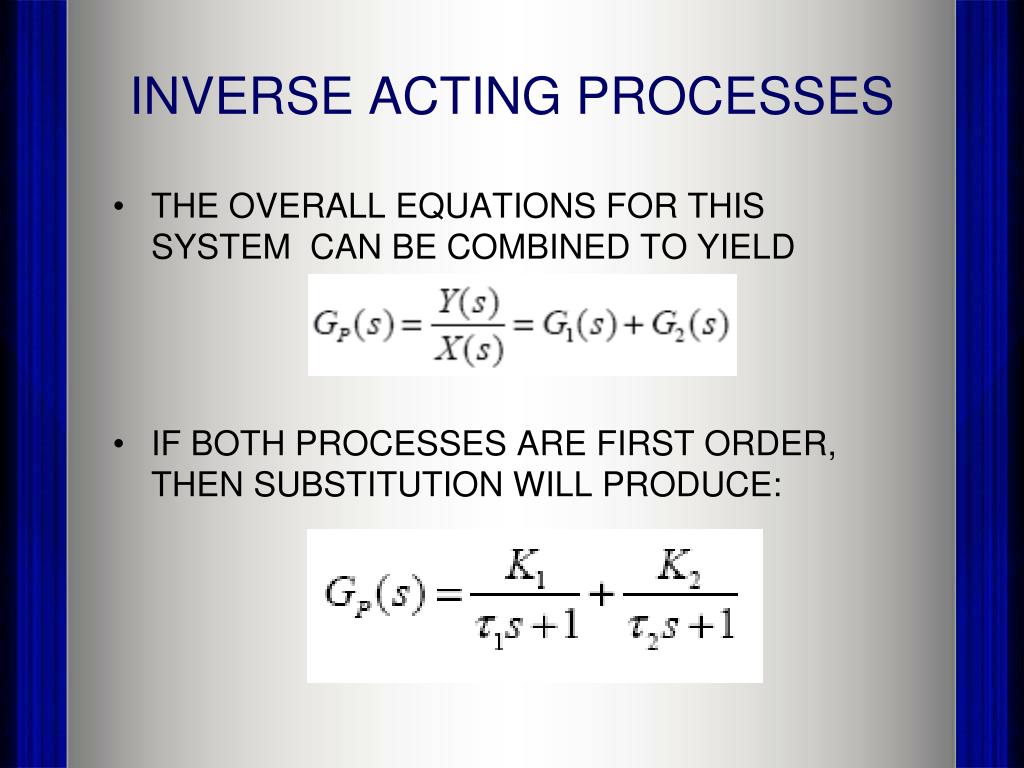 INVERSE ACTING PROCESSES • THE OVERALL EQUATIONS FOR THIS SYSTEM CAN BE COMBINED TO YIELD • IF BOTH PROCESSES ARE FIRST ORDER, THEN SUBSTITUTION WILL PRODUCE:
