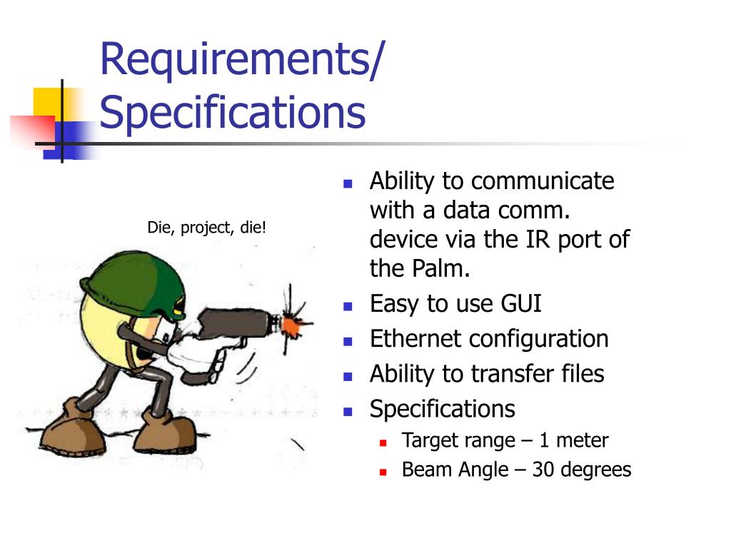 Requirements/Specifications • Ability to communicate with a data comm. device via the IR port of the Palm. • Easy to use GUI • Ethernet configuration • Ability to transfer files • Specifications • Target range – 1 meter • Beam Angle – 30 degrees Die, project, die!