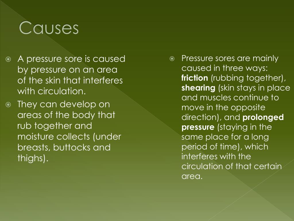 Causes A pressure sore is caused by pressure on an area of the skin that interferes with circulation. They can develop on areas of the body that rub together and moisture collects (under breasts, buttocks and thighs). Pressure sores are mainly caused in three ways: friction (rubbing together), shearing (skin stays in place and muscles continue to move in the opposite direction), and prolonged pressure (staying in the same place for a long period of time), which interferes with the circulation of that certain area.
