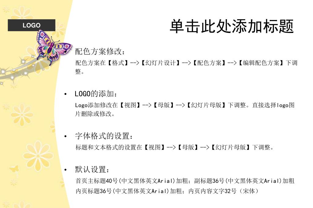 模板素材. 单击此处添加标题. 配色方案修改: 配色方案在 【 格式 】-->【 幻灯片设计 】-->【 配色方案 】-->【 编辑配色方案 】 下调整。 LOGO 的添加: Logo 添加修改在 【 视图 】-->【 母版 】-->【 幻灯片母版 】 下调整。直接选择 logo 图片删除或修改。 字体格式的设置: 标题和文本格式的设置在 【 视图 】-->【 母版 】-->【 幻灯片母版 】 下调整。 默认设置: 首页主标题 40 号(中文黑体英文 Arial )加粗;副标题 36 号(中文黑体英文 Arial )加粗