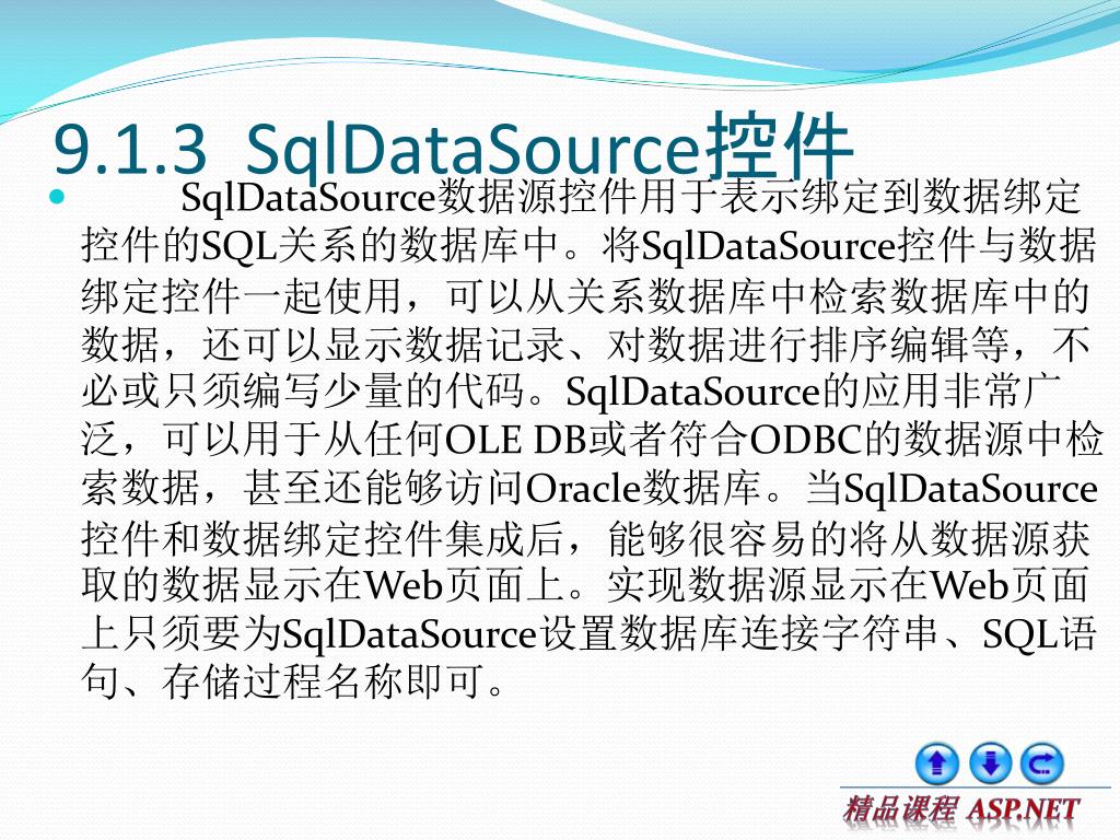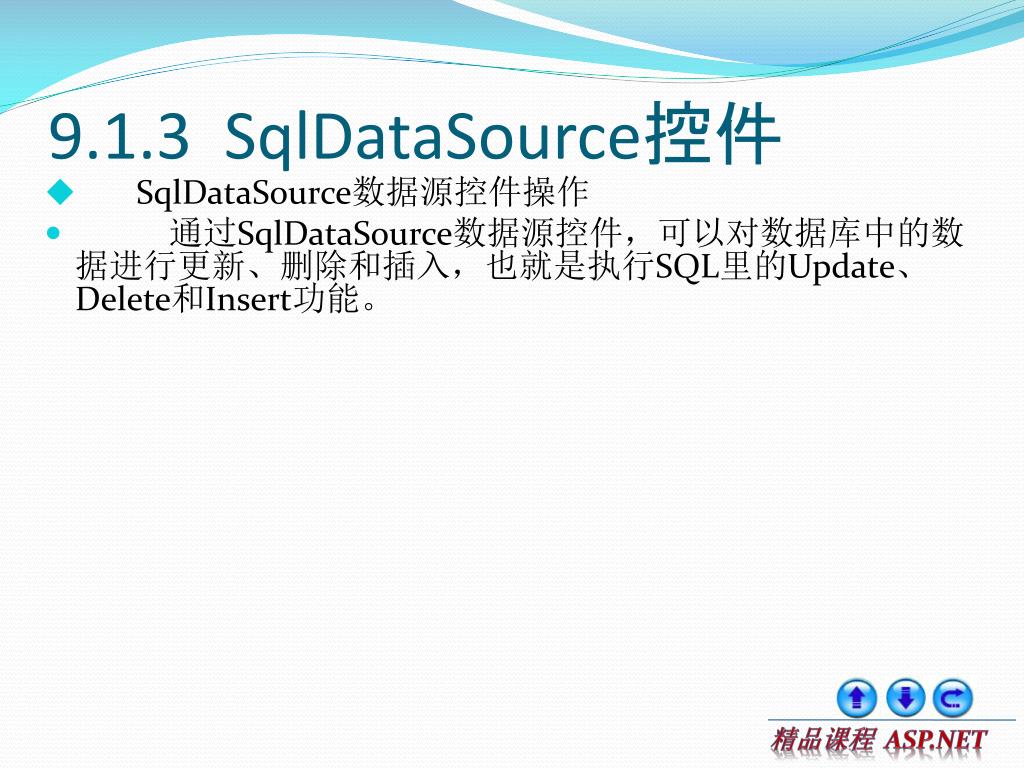 9.1.3 SqlDataSource控件 • SqlDataSource数据源控件操作 • 通过SqlDataSource数据源控件,可以对数据库中的数据进行更新、删除和插入,也就是执行SQL里的Update、Delete和Insert功能。