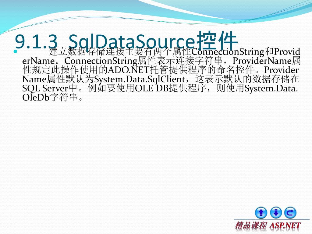 9.1.3 SqlDataSource控件 建立数据存储连接主要有两个属性ConnectionString和ProviderName。ConnectionString属性表示连接字符串,ProviderName属性规定此操作使用的ADO.NET托管提供程序的命名控件。ProviderName属性默认为System.Data.SqlClient,这表示默认的数据存储在SQL Server中。例如要使用OLE DB提供程序,则使用System.Data.OleDb字符串。