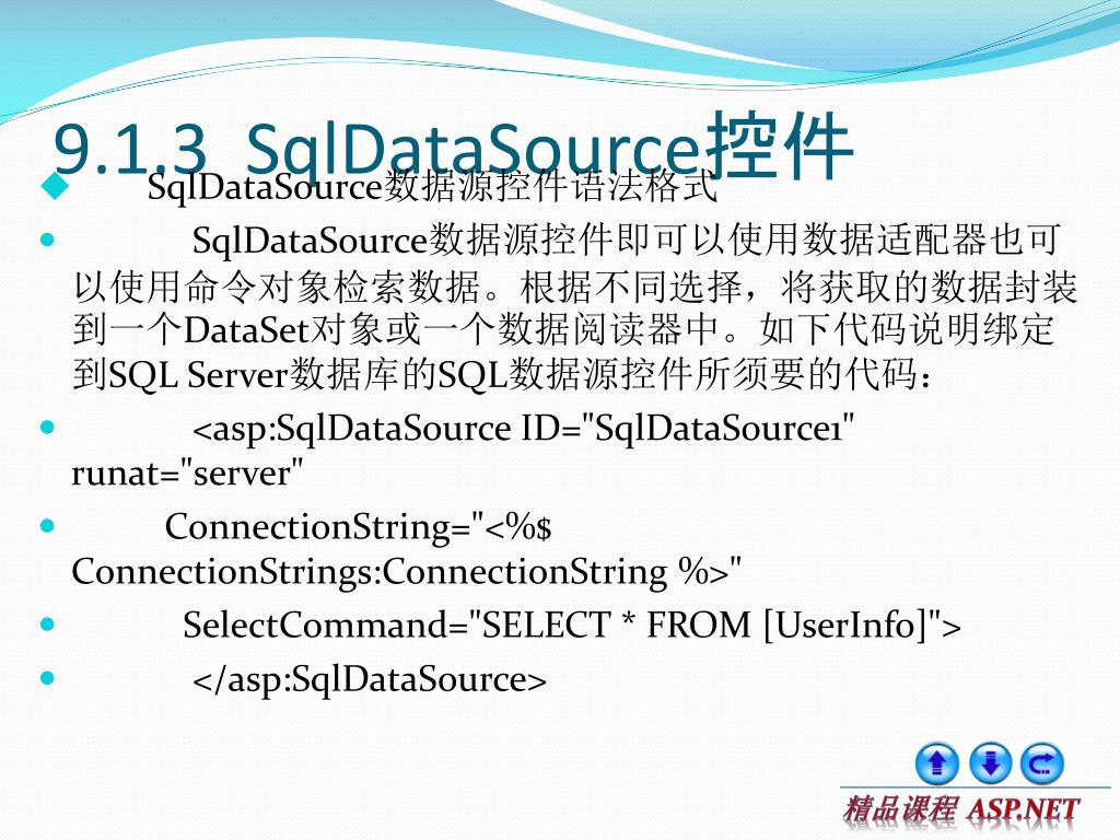 9.1.3 SqlDataSource控件 • SqlDataSource数据源控件语法格式 • SqlDataSource数据源控件即可以使用数据适配器也可以使用命令对象检索数据。根据不同选择,将获取的数据封装到一个DataSet对象或一个数据阅读器中。如下代码说明绑定到SQL Server数据库的SQL数据源控件所须要的代码: • <asp:SqlDataSource ID="SqlDataSource1" runat="server" • ConnectionString="<%$ ConnectionStrings:ConnectionString %>" • SelectCommand="SELECT * FROM [UserInfo]"> • </asp:SqlDataSource>
