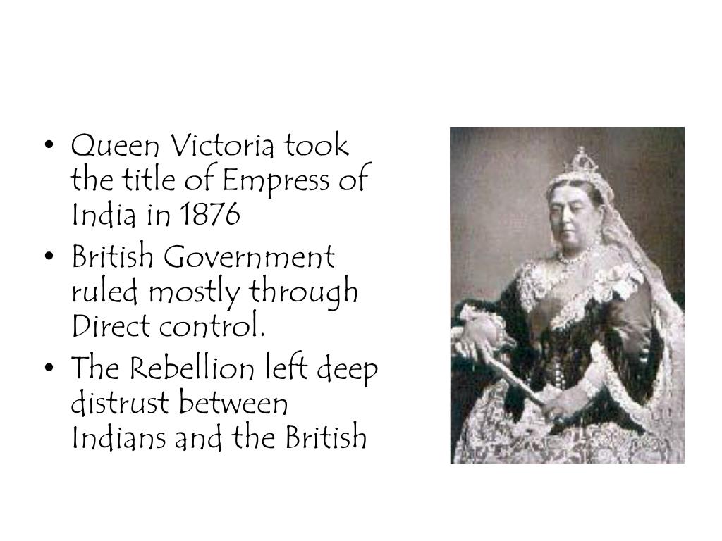 Queen Victoria took the title of Empress of India in 1876 • British Government ruled mostly through Direct control. • The Rebellion left deep distrust between Indians and the British