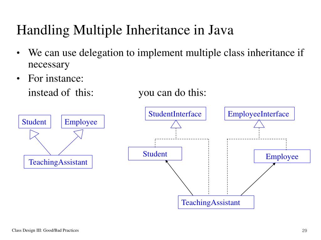 Multiple Inheritance Example (continued) publicclass Employee implements EmployeeInterface { protected float salary; public float getSalary() { // code for Salary } } publicclass TeachingAssistant implements StudentInterface, EmployeeInterface { private Student student; private Employee employee;