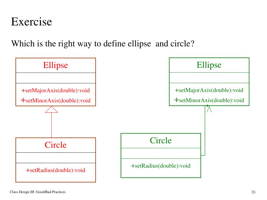 Ellipse +setMajorAxis(double):void+setMinorAxis(double):void Ellipse +setMajorAxis(double):void+setMinorAxis(double):void Circle +setRadius(double):void Circle +setRadius(double):void Exercise Which is the right way to define ellipse and circle?
