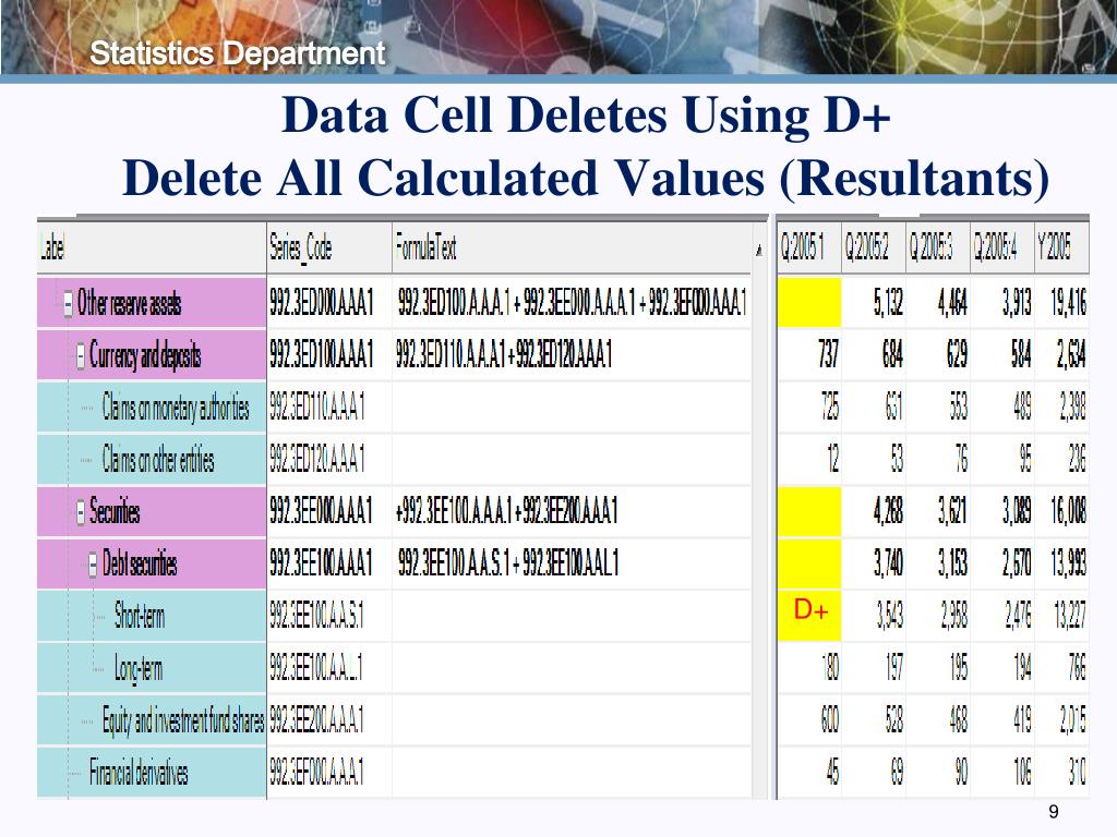 Secondary Data Cell DeletesUsing D+, D*, D+* • D+ Delete all calculated values (resultants) of the primary data delete • Use the equation graph (formula tree) of the database system; All resultants of the primary data delete are deleted • D* Delete all consolidated values of the primary data delete • Use the consolidation method of each data series (e.g., delete of a monthly data value will result in the delete of quarterly and annual values) • D+* Delete all calculated and consolidated values of the primary data delete