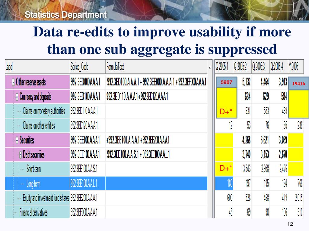 IT Implementations • Access level restrictions • Omissions • For countries that have established patterns of data suppressions, and the required secondary suppressions are already analyzed, secondary data series will be omitted at the time of data load. • Suppressions of Aggregates • Dominance rule (largest reporter = 80% of total, two largest = 90%) • Depend on number of reporters • Suppression of primary and secondary cells • Data re-edits for improve usability