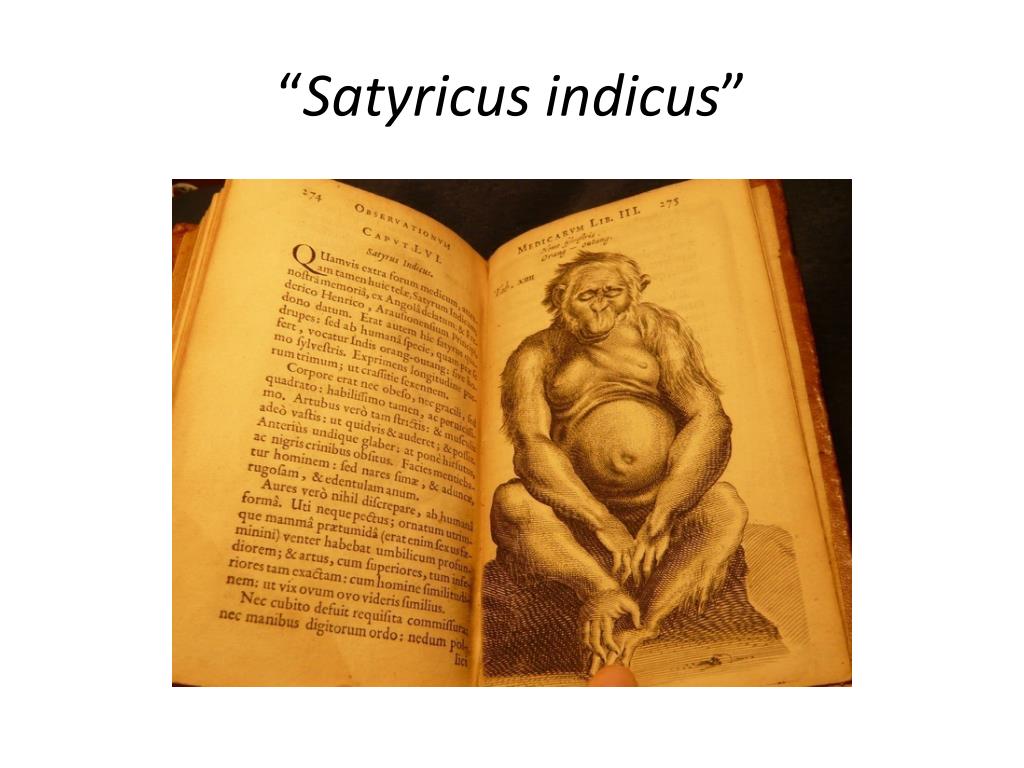 1600’s: Anatomists examine apes • 1641: Nicolas Tulp publishes “Homo sylvestris: Orang-outang” in Observationesmedicae --observations on (live) juvenile female ape, probably chimpanzee, in the menagerie of Frederick Henry, Prince of Orange. --equated with the satyr of antiquity (e.g., Pliny)
