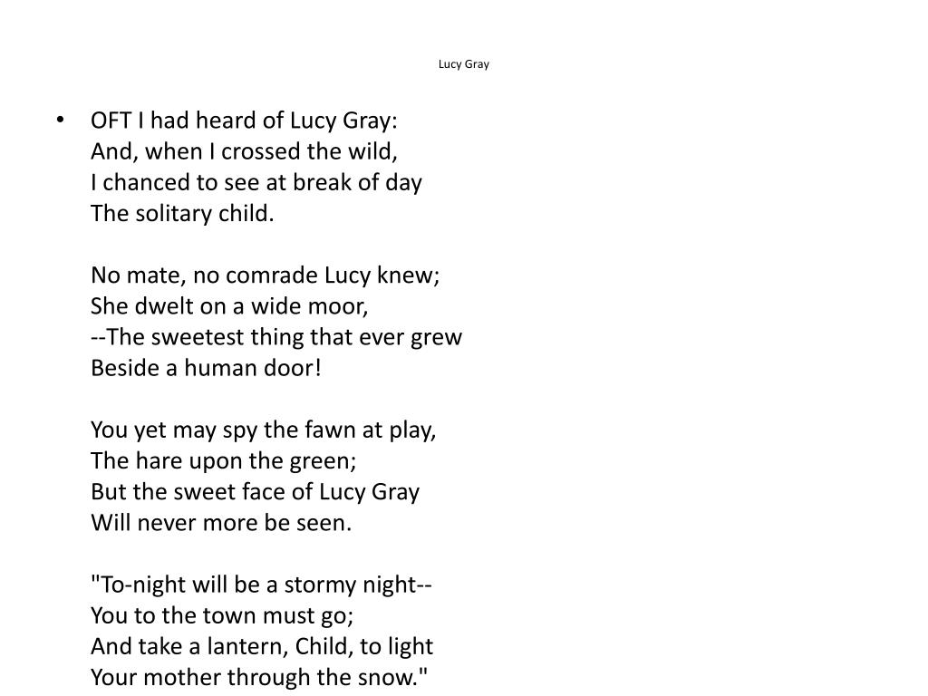 Lucy Gray • OFT I had heard of Lucy Gray: And, when I crossed the wild, I chanced to see at break of day The solitary child. No mate, no comrade Lucy knew; She dwelt on a wide moor, --The sweetest thing that ever grew Beside a human door! You yet may spy the fawn at play, The hare upon the green; But the sweet face of Lucy Gray Will never more be seen. "To-night will be a stormy night-- You to the town must go; And take a lantern, Child, to light Your mother through the snow."