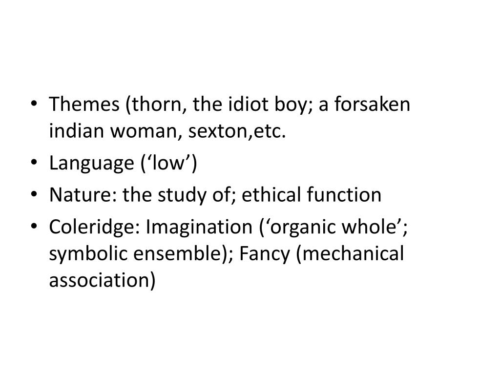 Themes (thorn, the idiot boy; a forsakenindian woman, sexton,etc. • Language (‘low’) • Nature: the study of; ethicalfunction • Coleridge: Imagination (‘organicwhole’; symbolic ensemble); Fancy (mechanicalassociation)