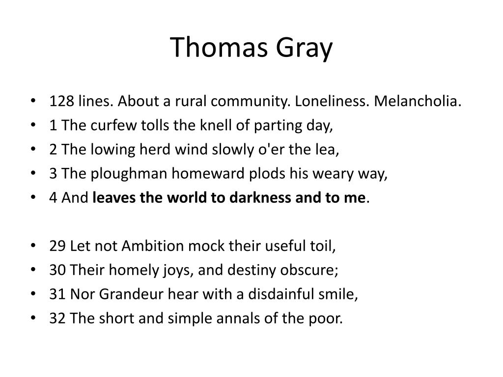 Thomas Gray • 128 lines. About a rural community. Loneliness. Melancholia. • 1 The curfew tolls the knell of parting day, • 2 The lowing herd wind slowly o'er the lea, • 3 The ploughman homeward plods his weary way, • 4 And leaves the world to darkness and to me. • 29 Let not Ambition mock their useful toil, • 30 Their homely joys, and destiny obscure; • 31 Nor Grandeur hear with a disdainful smile, • 32 The short and simple annals of the poor.