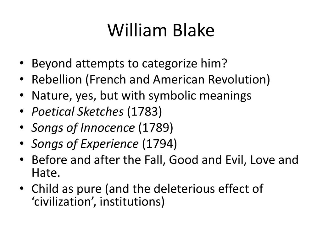 William Blake • Beyondattempts to categorizehim? • Rebellion (French and American Revolution) • Nature, yes, butwithsymbolicmeanings • PoeticalSketches(1783) • Songs of Innocence(1789) • Songs of Experience(1794) • Before and after the Fall, Good and Evil, Love and Hate. • Childas pure (and the deleteriouseffect of ‘civilization’, institutions)