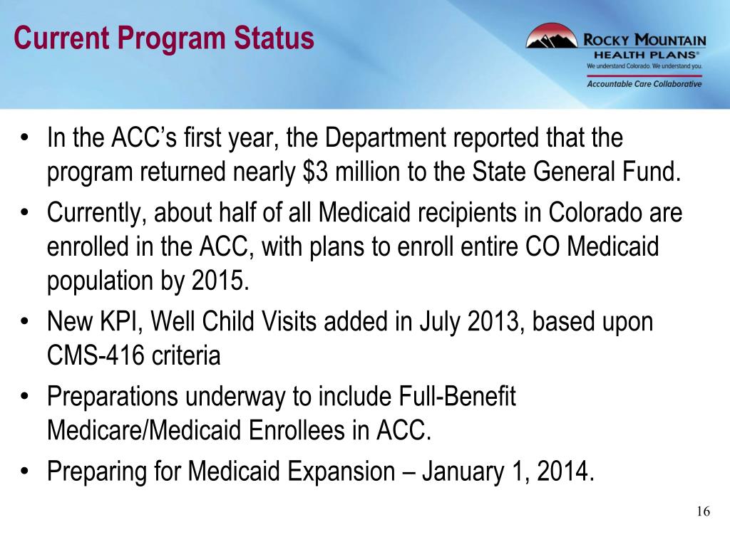 Current Program Status • In the ACC’s first year, the Department reported that the program returned nearly $3 million to the State General Fund. • Currently, about half of all Medicaid recipients in Colorado are enrolled in the ACC, with plans to enroll entire CO Medicaid population by 2015. • New KPI, Well Child Visits added in July 2013, based upon CMS-416 criteria • Preparations underway to include Full-Benefit Medicare/Medicaid Enrollees in ACC. • Preparing for Medicaid Expansion – January 1, 2014.