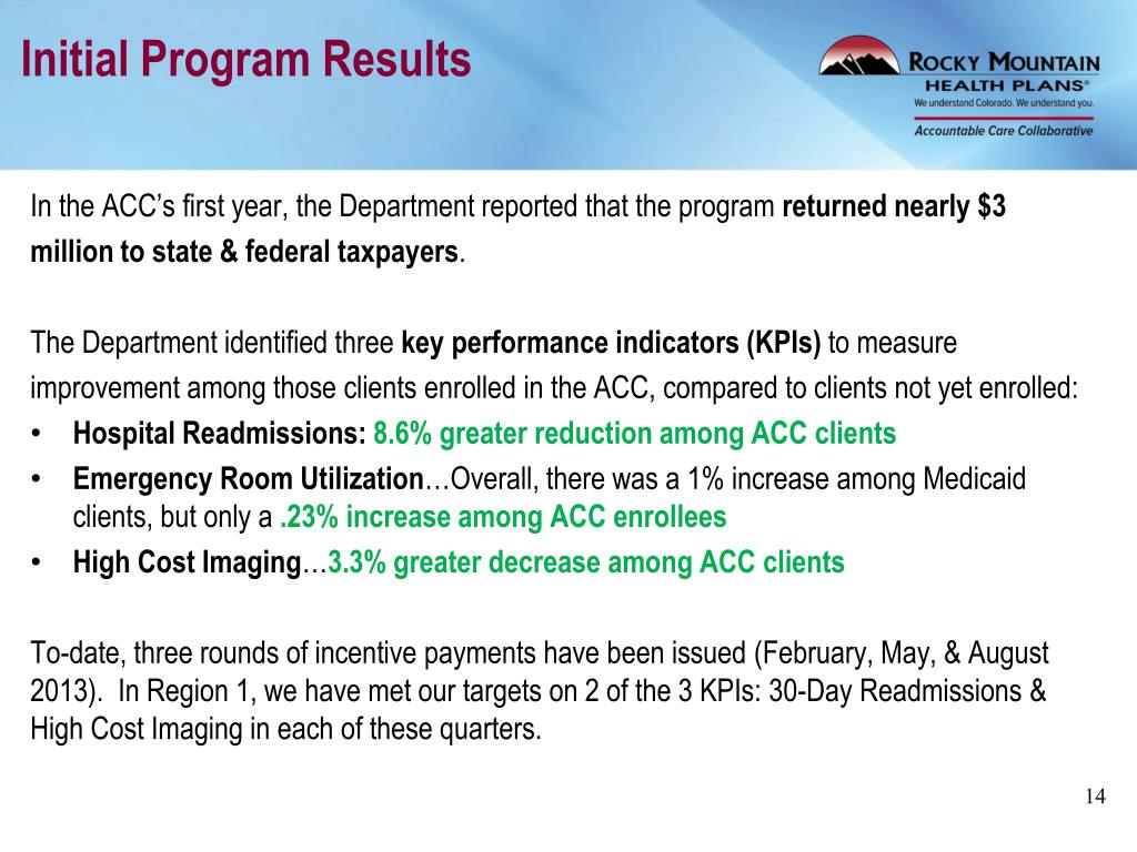 Initial Program Results • In the ACC’s first year, the Department reported that the program returned nearly $3 • million to state & federal taxpayers. • The Departmentidentified three key performance indicators (KPIs) to measure • improvement among those clients enrolled in the ACC, compared to clients not yet enrolled: • Hospital Readmissions: 8.6% greater reduction among ACC clients • Emergency Room Utilization…Overall, there was a 1% increase among Medicaid clients, but only a .23% increase among ACC enrollees • High Cost Imaging…3.3% greater decrease among ACC clients • To-date, three rounds of incentive payments have been issued (February, May, & August 2013). In Region 1, we have met our targets on 2 of the 3 KPIs: 30-Day Readmissions & High Cost Imaging in each of these quarters.