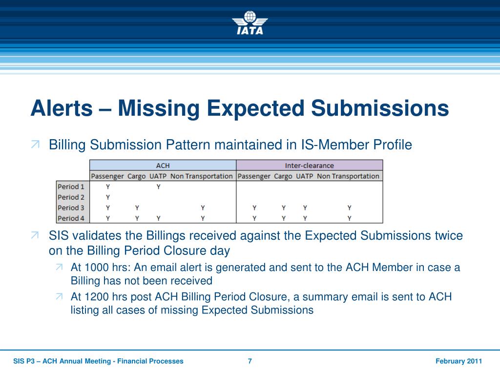 Alerts – Missing Expected Submissions SIS P3 – ACH Annual Meeting - Financial Processes • Billing Submission Pattern maintained in IS-Member Profile • SIS validates the Billings received against the Expected Submissions twice on the Billing Period Closure day • At 1000 hrs: An email alert is generated and sent to the ACH Member in case a Billing has not been received • At 1200 hrs post ACH Billing Period Closure, a summary email is sent to ACH listing all cases of missing Expected Submissions