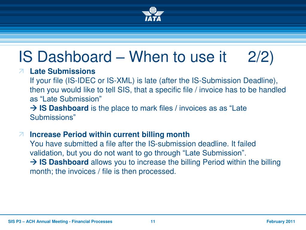IS Dashboard – When to use it 2/2) SIS P3 – ACH Annual Meeting - Financial Processes Late SubmissionsIf your file (IS-IDEC or IS-XML) is late (after the IS-Submission Deadline), then you would like to tell SIS, that a specific file / invoice has to be handled as “Late Submission” IS Dashboard is the place to mark files / invoices as as “Late Submissions” Increase Period within current billing monthYou have submitted a file after the IS-submission deadline. It failed validation, but you do not want to go through “Late Submission”. IS Dashboard allows you to increase the billing Period within the billing month; the invoices / file is then processed.