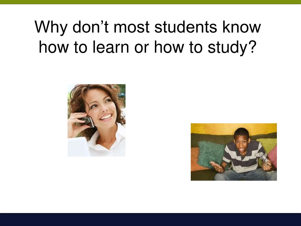 Reflection Questions • What’s the difference, if any, between studying and learning? • For which task would you study more? A. Make an A on the test B. Teach the material to the class